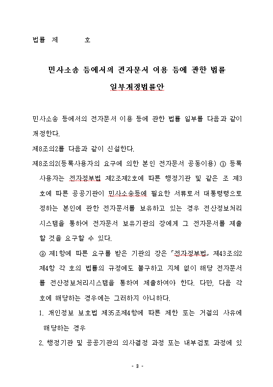 재판당사자 등이 본인에 관한 전자문서를 보유하고 있는 기관의 장을 상대로 전산정보처리시스템을 통하여 해당 전자문서를 제출할 것을 요구할 수 있게 하고, 위 요구를 받은 기관의 장은 제출거부 사유가 없는 경우 지체 없이 해당 전자문서를 전산정보처리시스템을 통하여 제출하도록 함(안 제8조의2 신설)